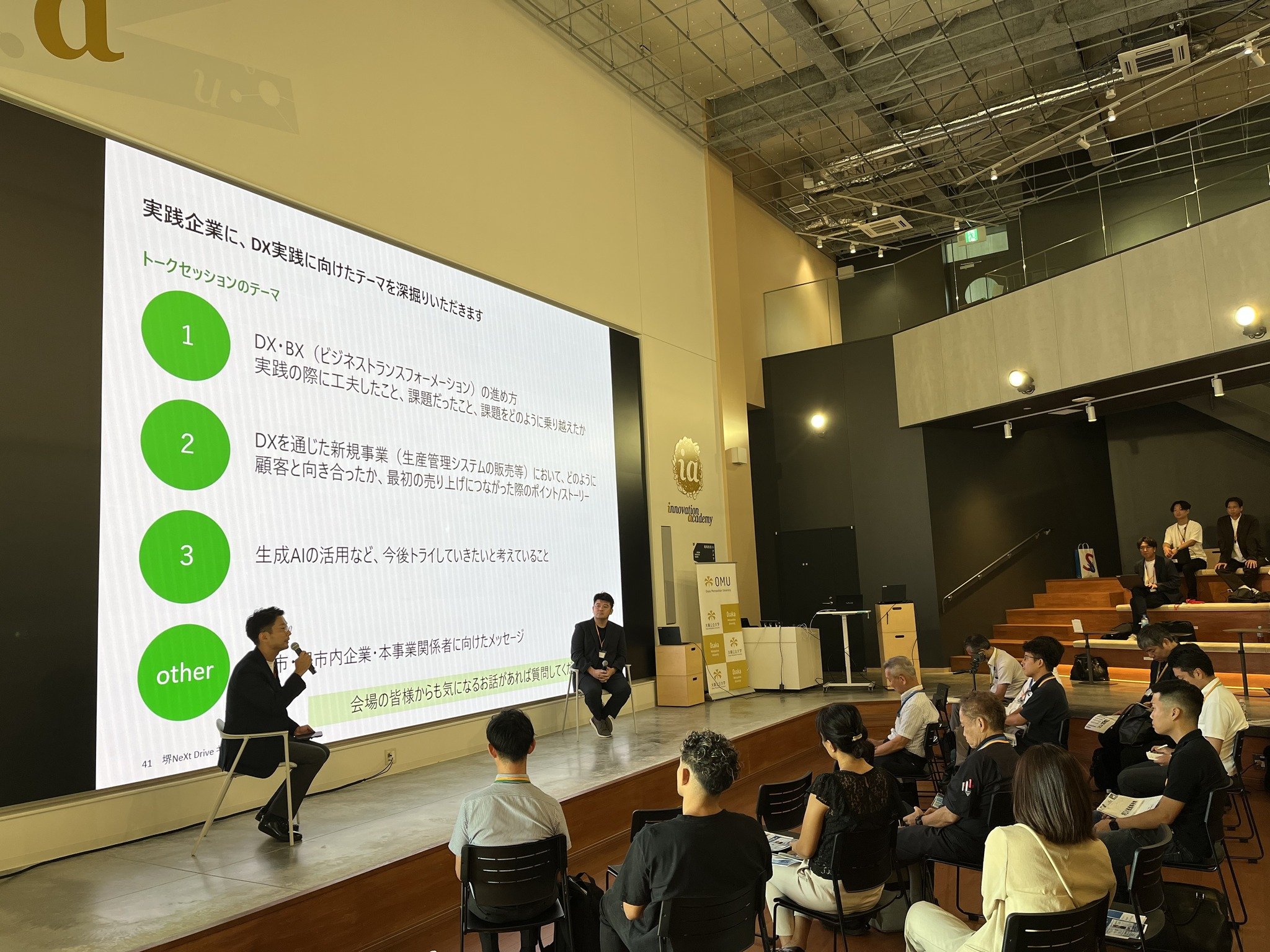 当日は、堺NeXtDriveの事業説明に加え、DXセレクション2024優良事例に選定された日本ツクリダス株式会社の角野様にご登壇いただき、DXを通じた新規事業創出の事例や成功のポイントについて実例を交えた貴重なお話をいただきました。また、現地とオンラインを通じて多くの企業の皆さまや支援機関の方々にご参加いただき、堺市内企業のDXへの熱量を感じる機会となりました。